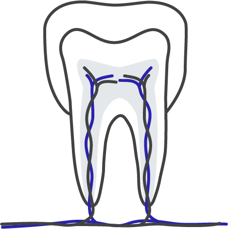 Akute Schmerzen können durch eine Entzündung beim vitalen oder bei einem abgestorbenen Zahn entstehen. Im Hohlraum des Zahns befinden sich u.a. Blutgefässe sowie der Zahnnerv. Die Wurzelbehandlung wird hierbei eingesetzt, um das entzündete Gewebe im Nervenkanal zu entfernen und keimfrei zu verschliessen.
